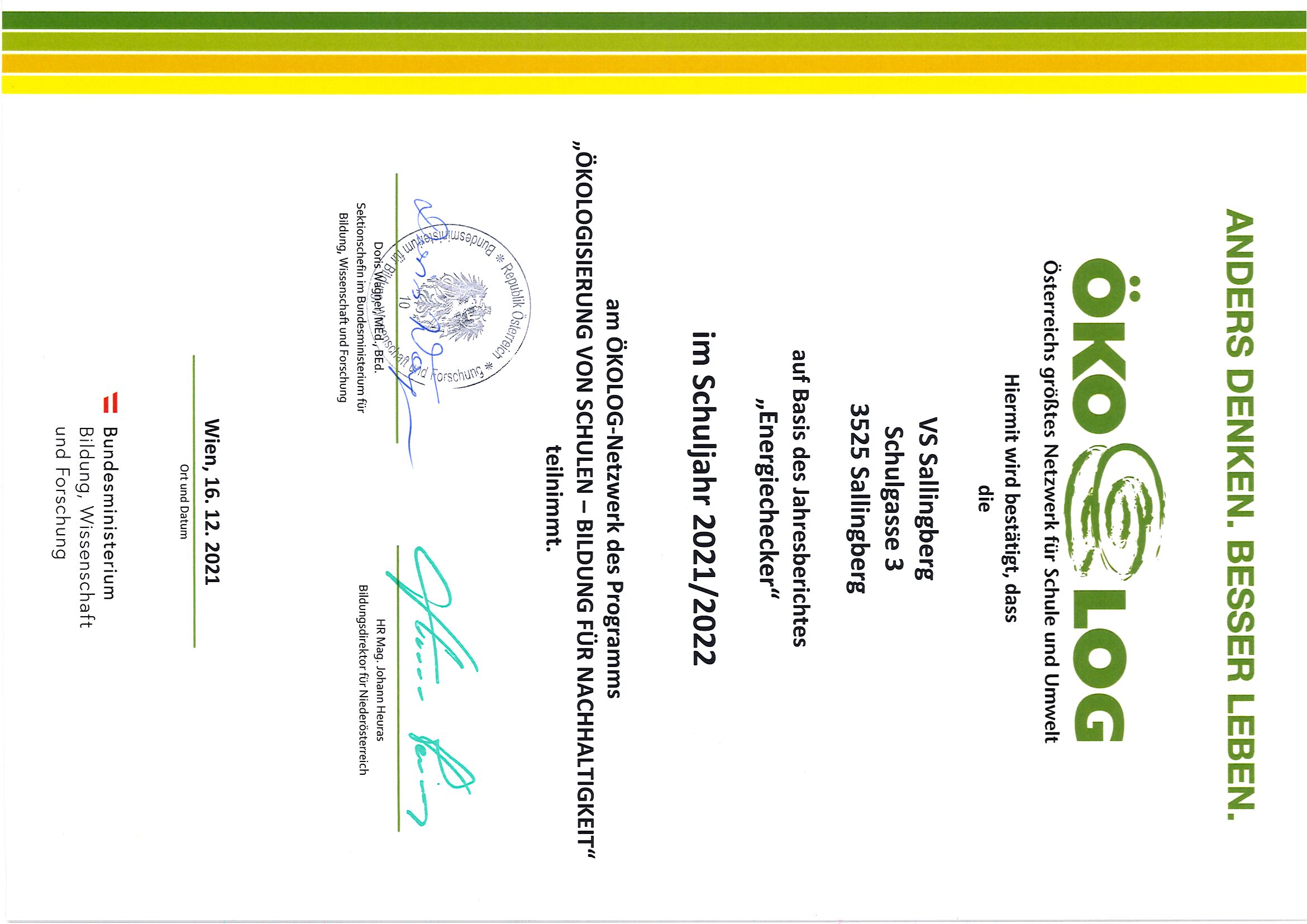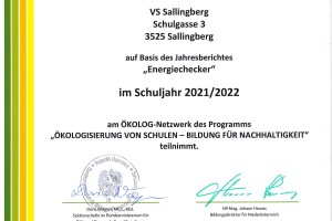 Bei dieser Fortbildung wurden schließlich Urkunden verliehen, auch unsere Volksschule Sallingberg bekam eine Auszeichnung, denn trotz Pandemie konnten wir unsere ÖKOLOG-Ziele einhalten und verfolgen weiterhin unser Programm „Energiechecker“.