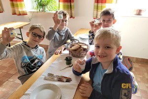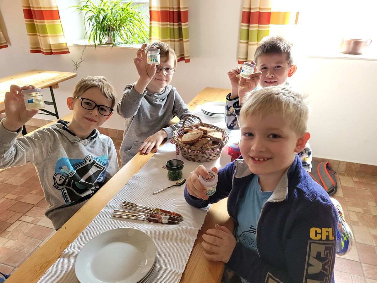Nachdem alle ihre eigene Butter geschüttelt hatten, gab es zur Stärkung Butterbrote mit Schnittlauch, dazu einen Film über den Weg der Milch in die Geschäfte und verschiedene Milchprodukte.
