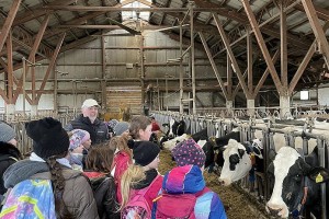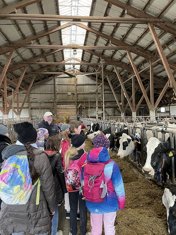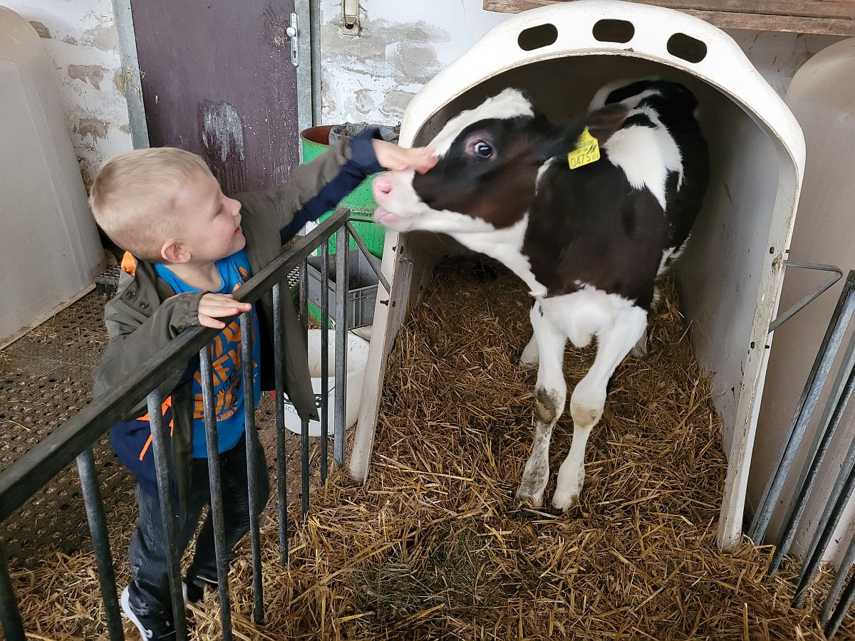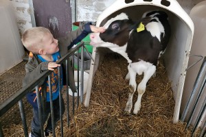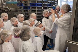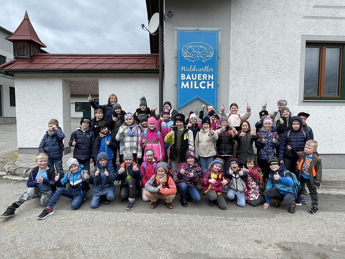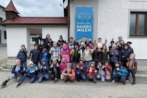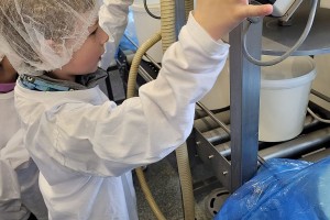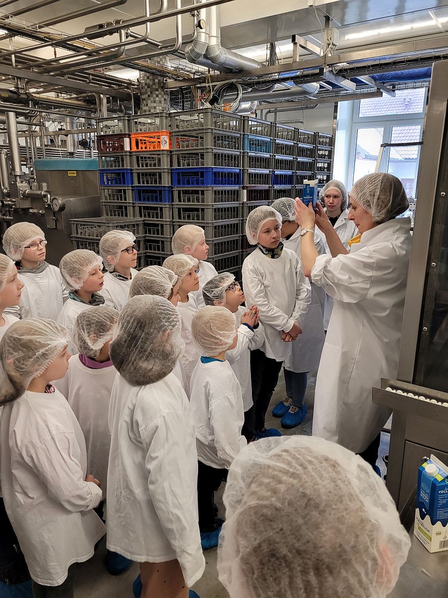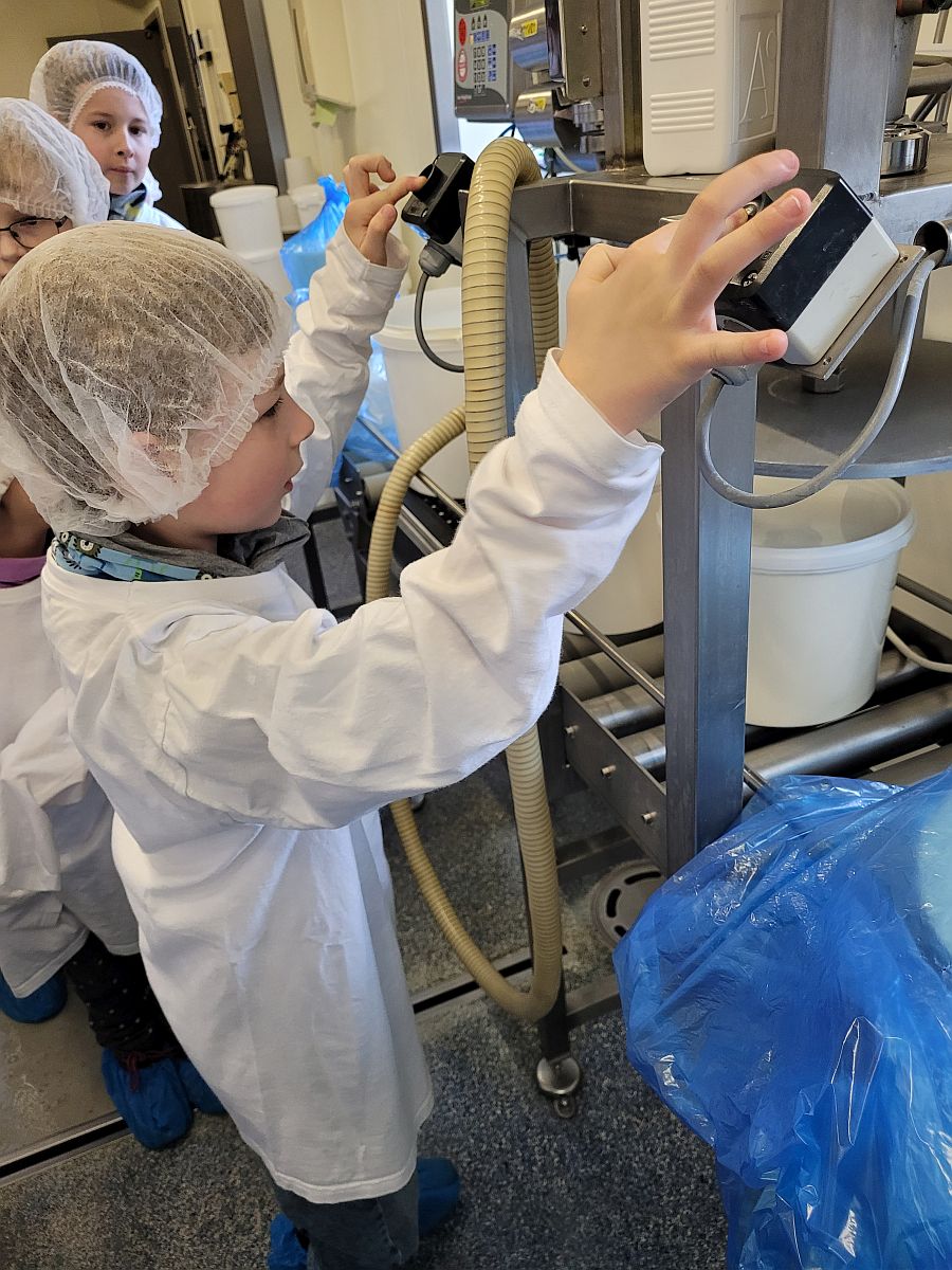 Wir konnten die Kühe im großen Stall bewundern, durften auch die kleinen Kälber streicheln. Nachdem sich alle Kinder und Erwachsenen in weiße Gewänder gehüllt hatten – sogar Hauben mussten wir aufsetzen – um den Hygienemaßnahmen gerecht zu werden, durften wir in der Produktionsstraße erfahren, wie die Milch ins Packerl kommt oder das Joghurt in den Becher.