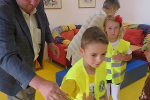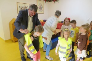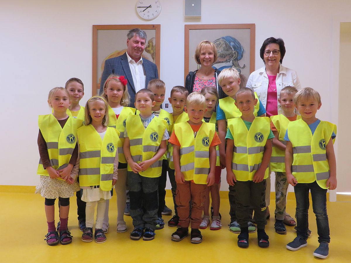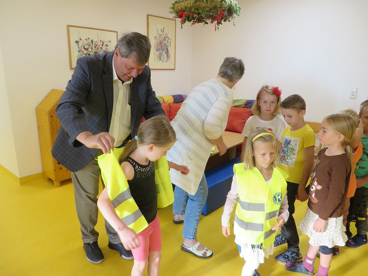 Er überraschte unsere Kleinen mit Warnwesten, die vom Kiwanis Club gespendet werden. Sie wurden natürlich sofort angezogen und stolz am Foto präsentiert.