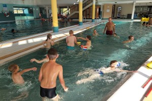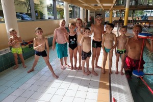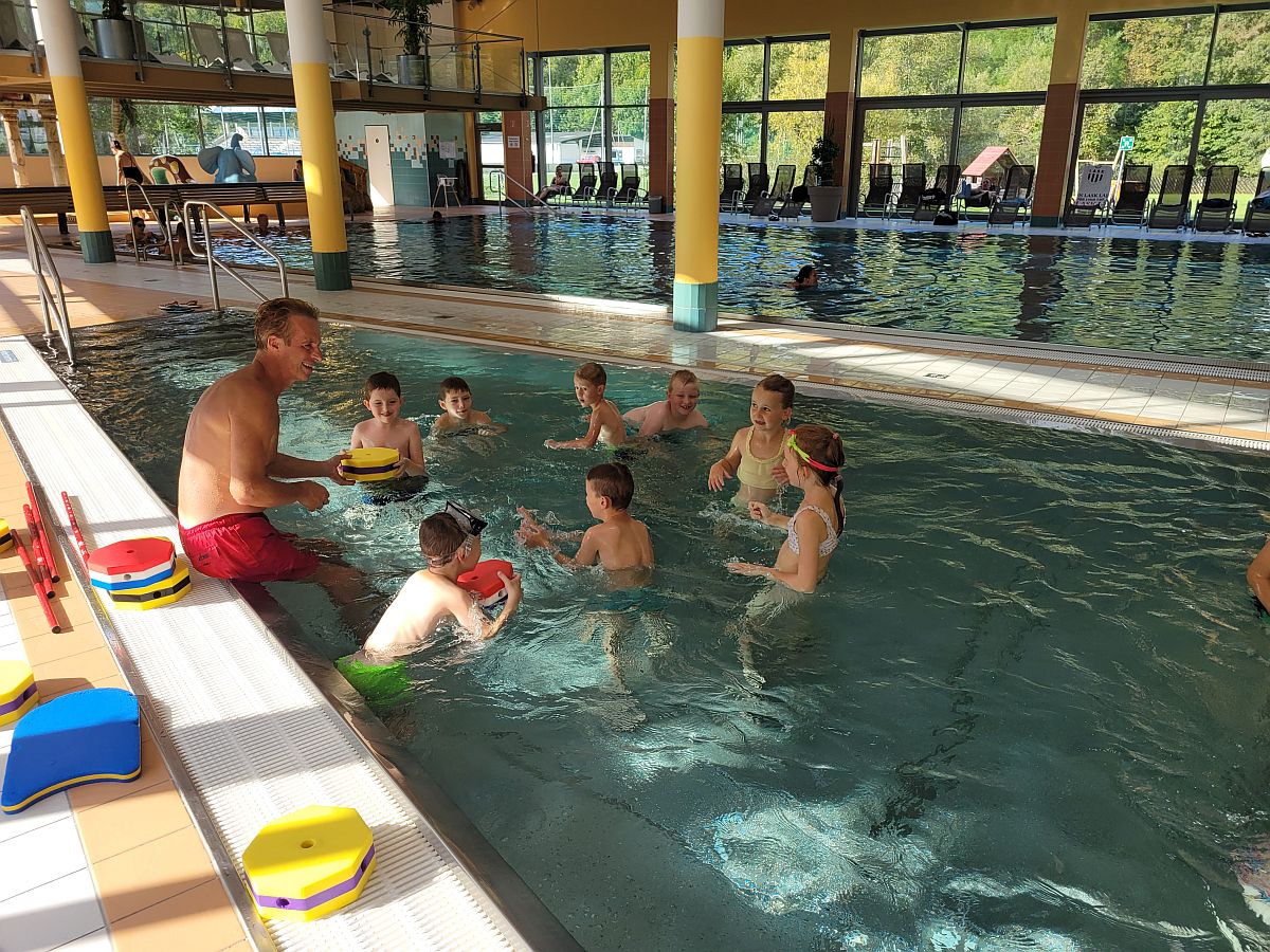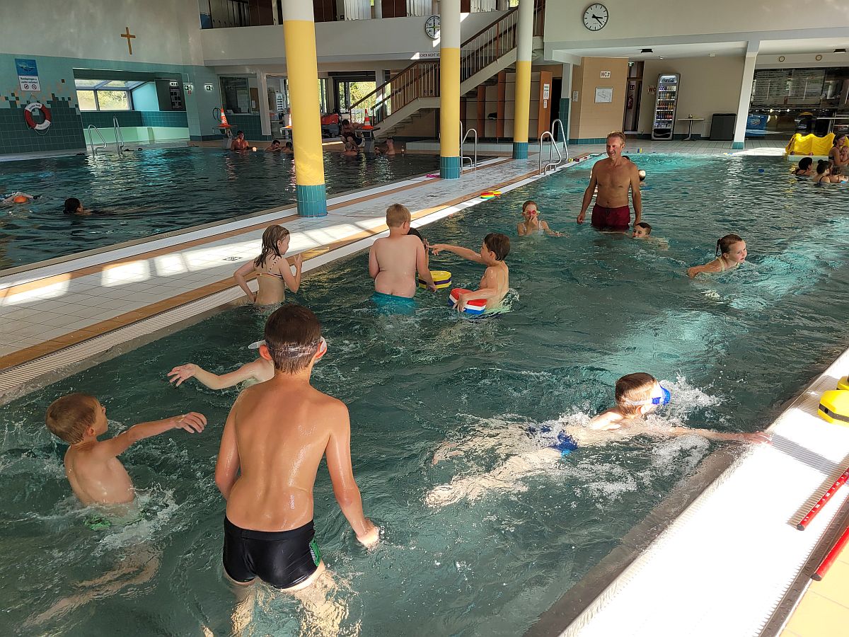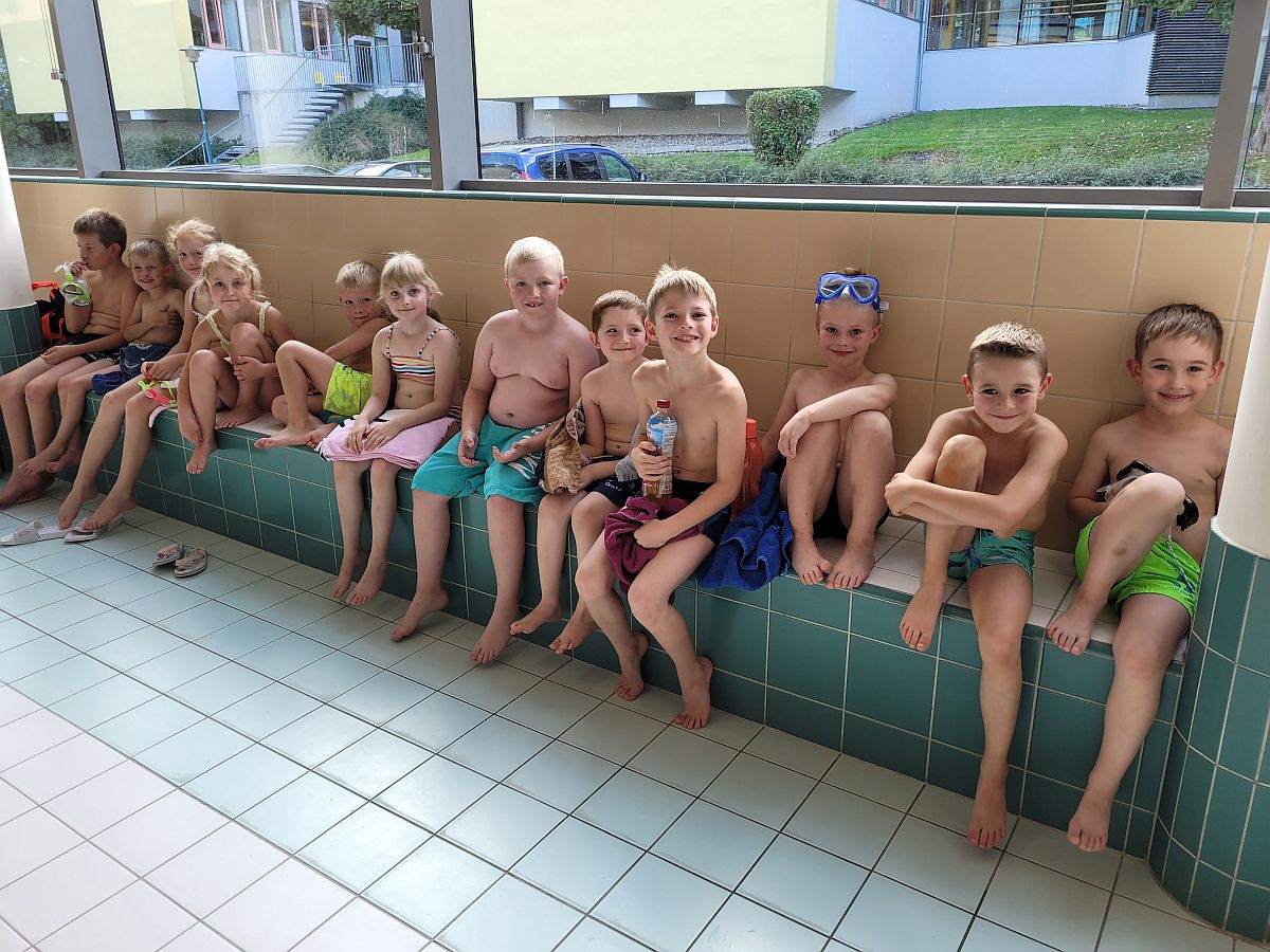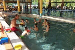 Unter der Leitung von SR Gerhard Schnabl aus der MS Ottenschlag und Sonja Hackl gibt es Wassergewöhnungsübungen, Spiele, Sprungtraining und Schwimmübungen. Auch die Rutsche wird fleißig frequentiert.