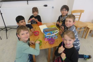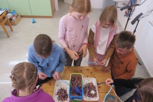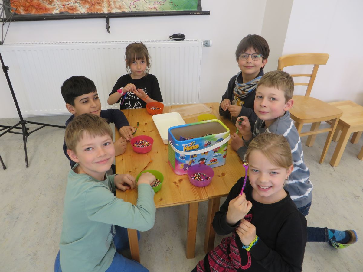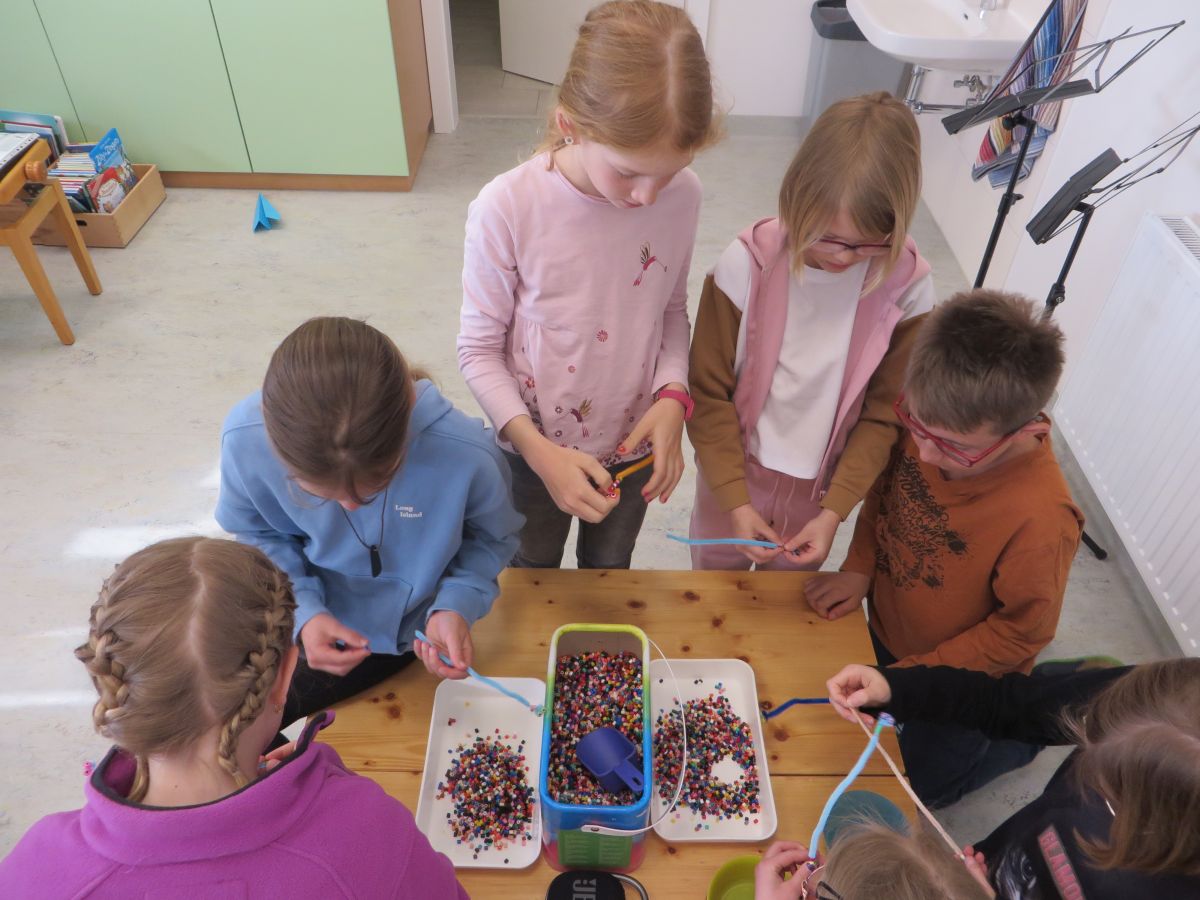 Zum Schluss durften alle Kinder in den mitgebrachten Büchern schmökern und diese auch ausborgen. Voller Begeisterung fädelten die Kinder auch eigene Bücherwürmer aus Steckperlen.