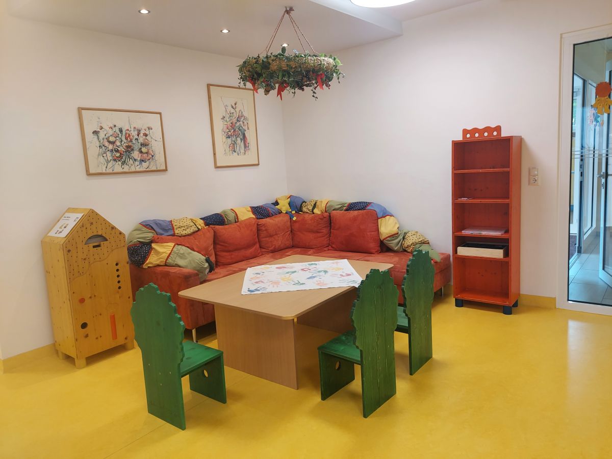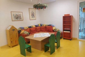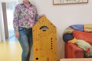 Das gelbe Häuschen, das rote Regal mit Krone und das Bänkchen passen gut in die Aula. Herzlichen Dank an Familie Rametsteiner!