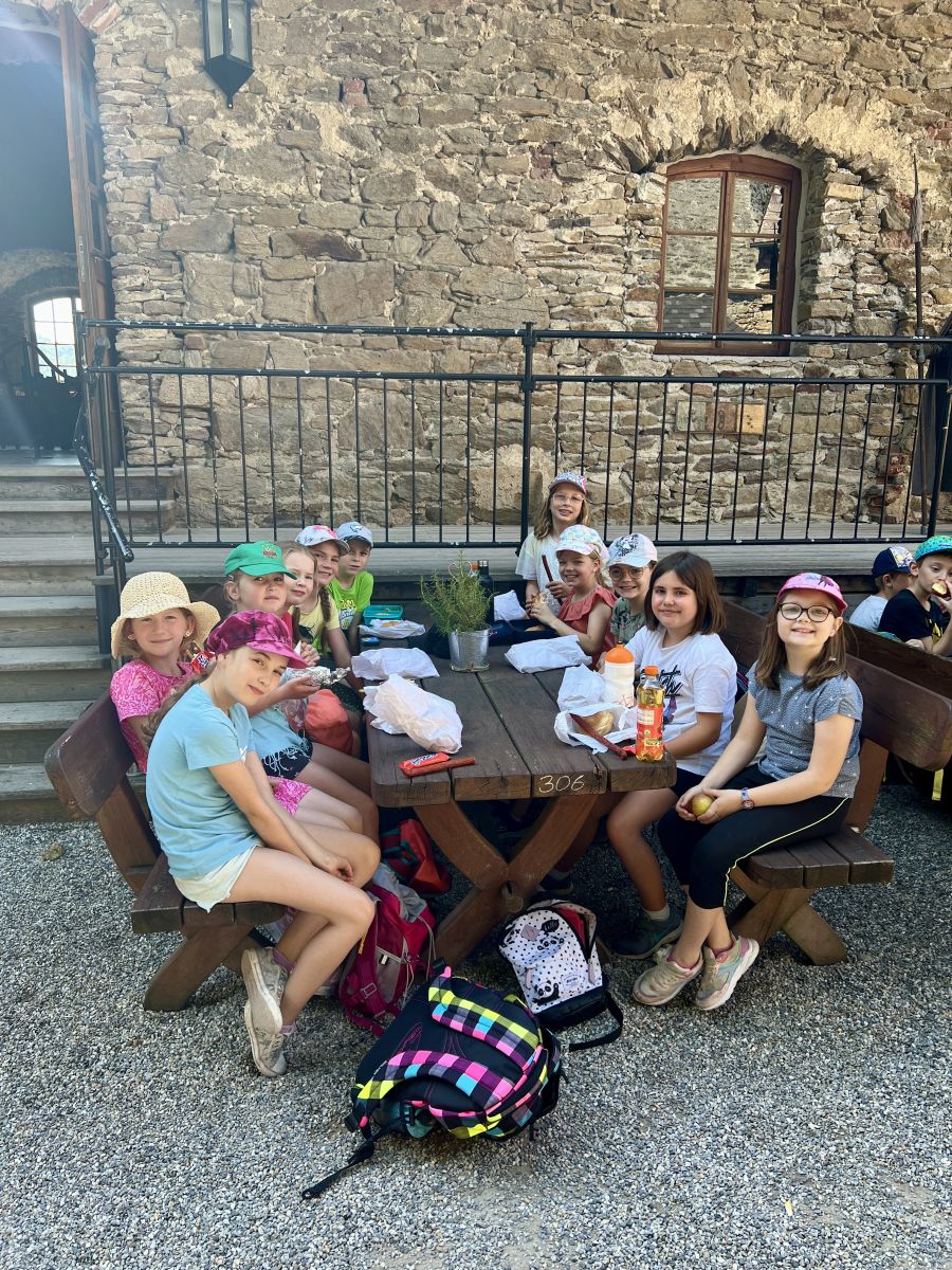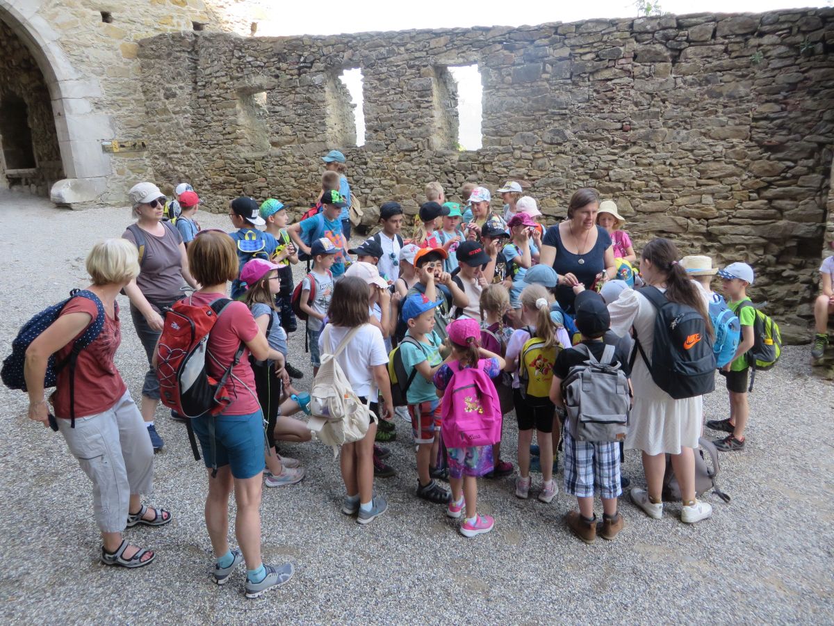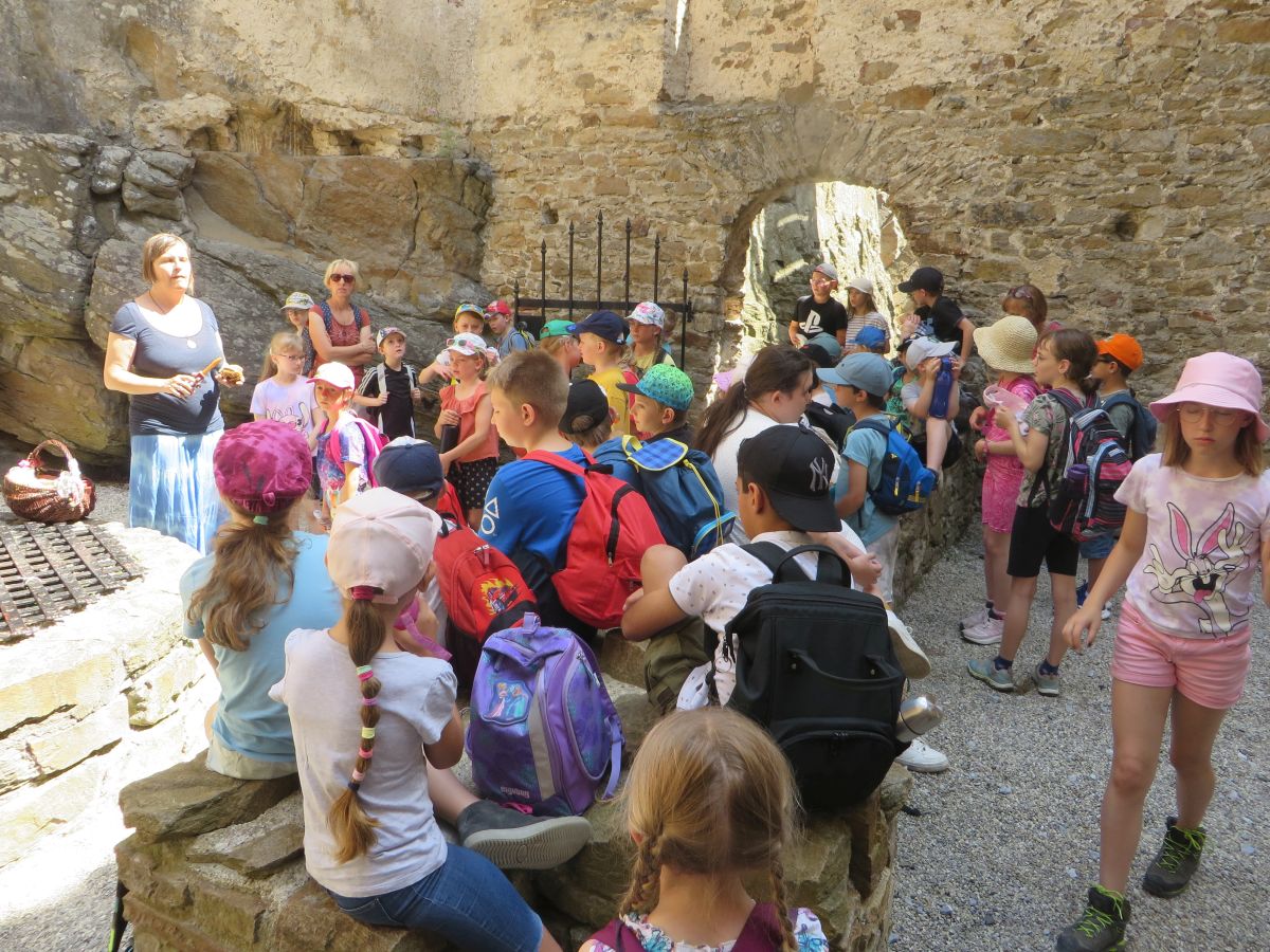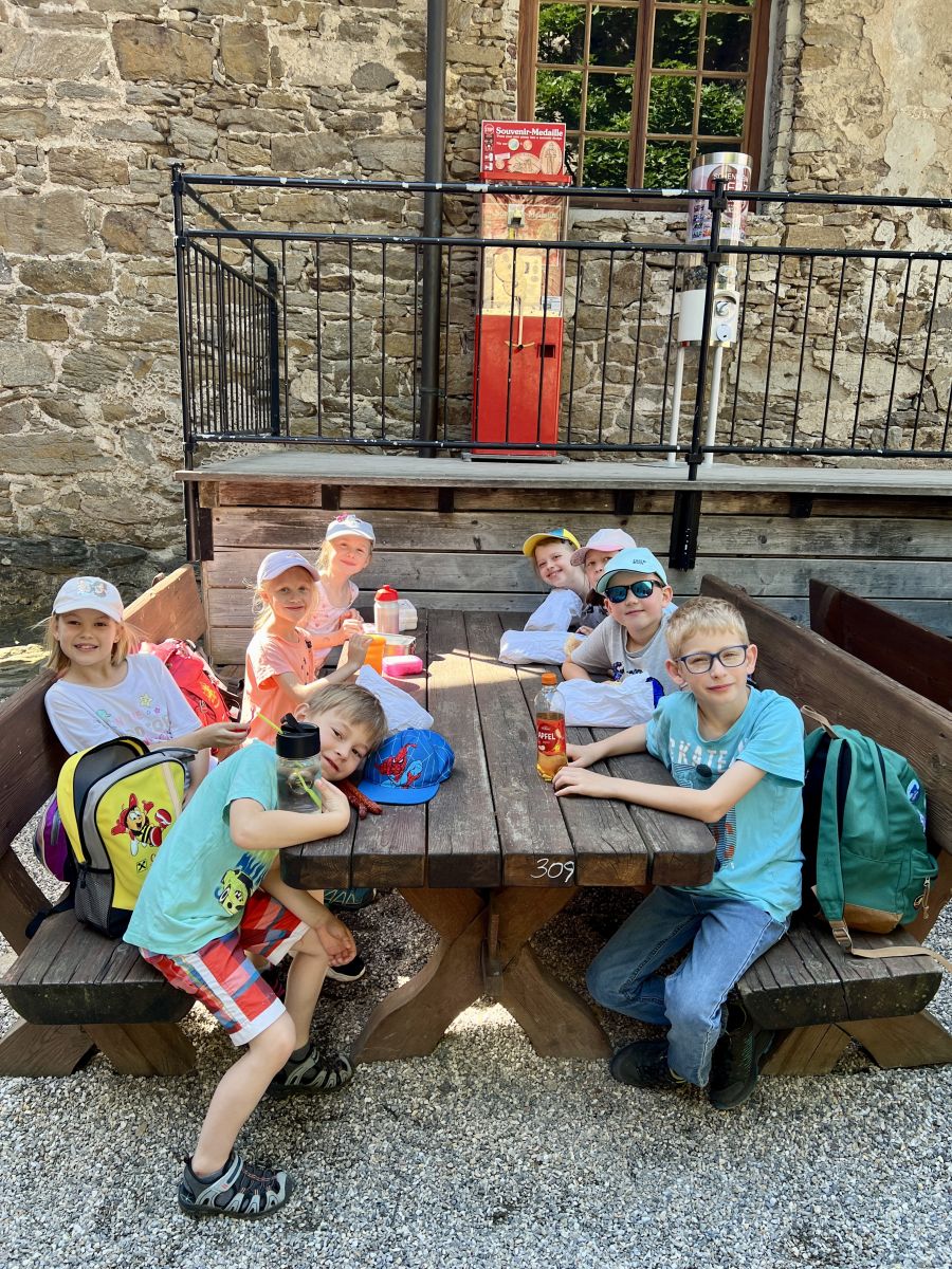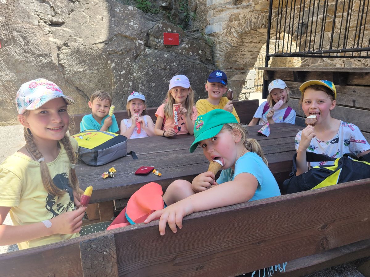 Nach dem abwechslungsreichen Frühstück und dem Einpacken holten uns am Mittwoch der Bus mit den Kindern der 1. und 2. Schulstufe und ihrer Lehrerin Sonja Hackl ab. Wir stiegen zu und fuhren zur Burgruine Aggstein. Dort unterhielt uns Märchenerzählerin Dena Seidl mit ihren wunderbaren Geschichten. Zum Abschluss ging es noch auf Schnitzeljagd und dann nach Hause.