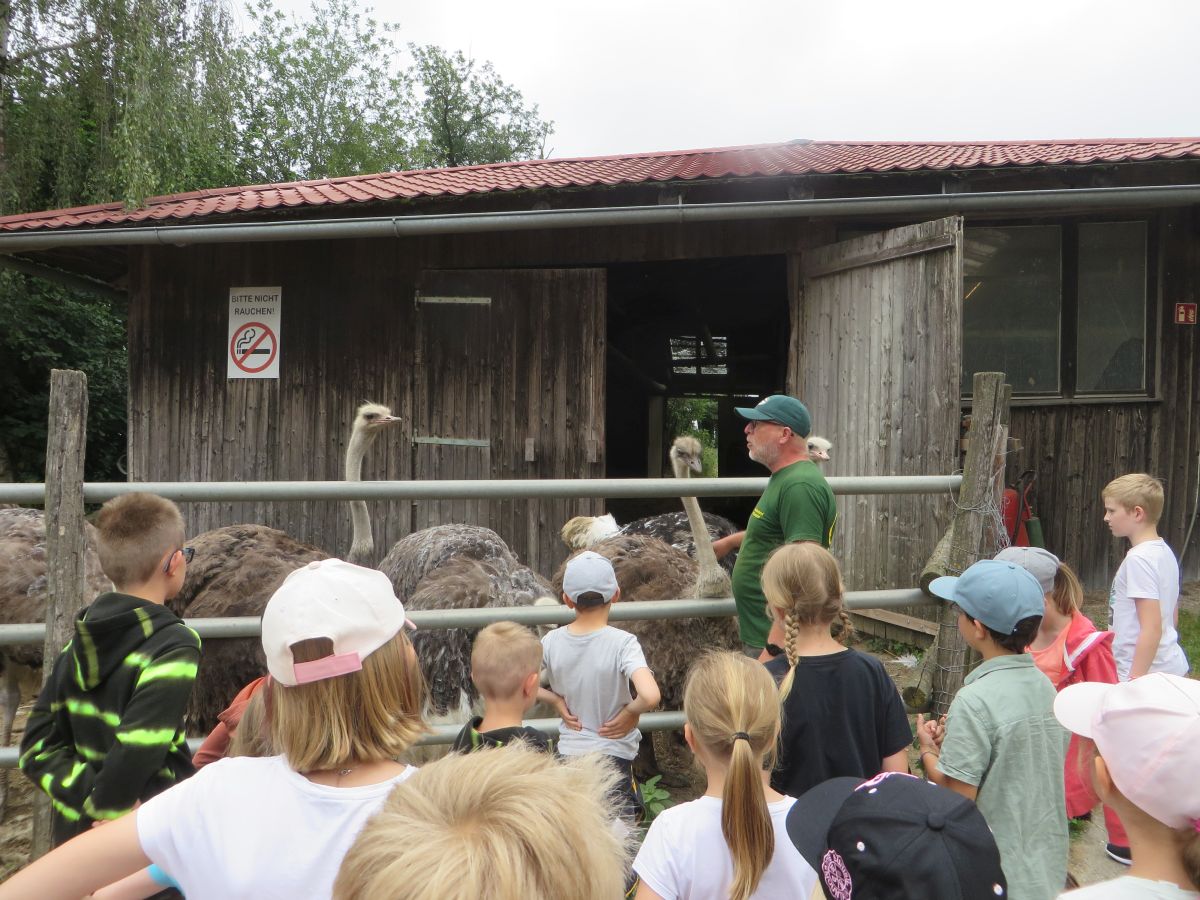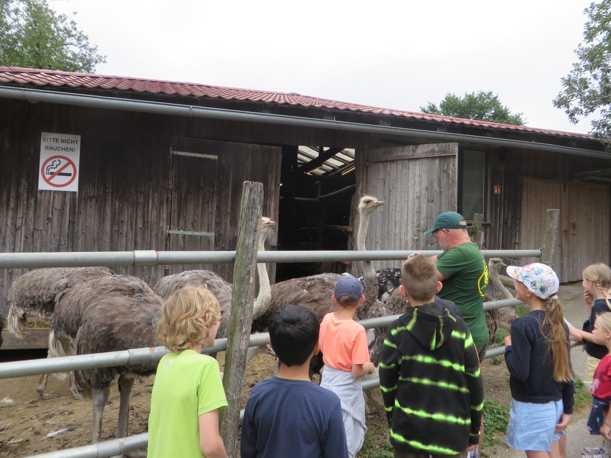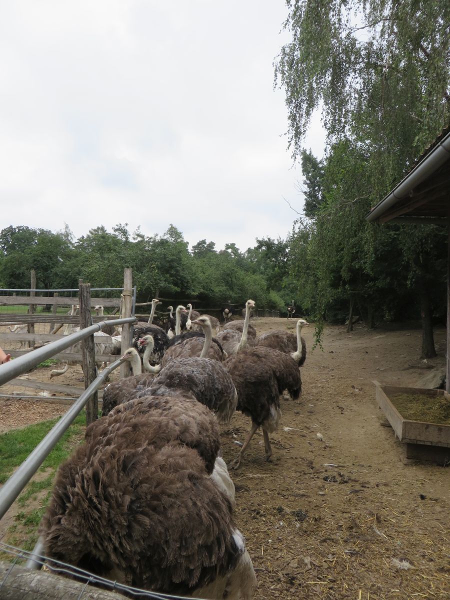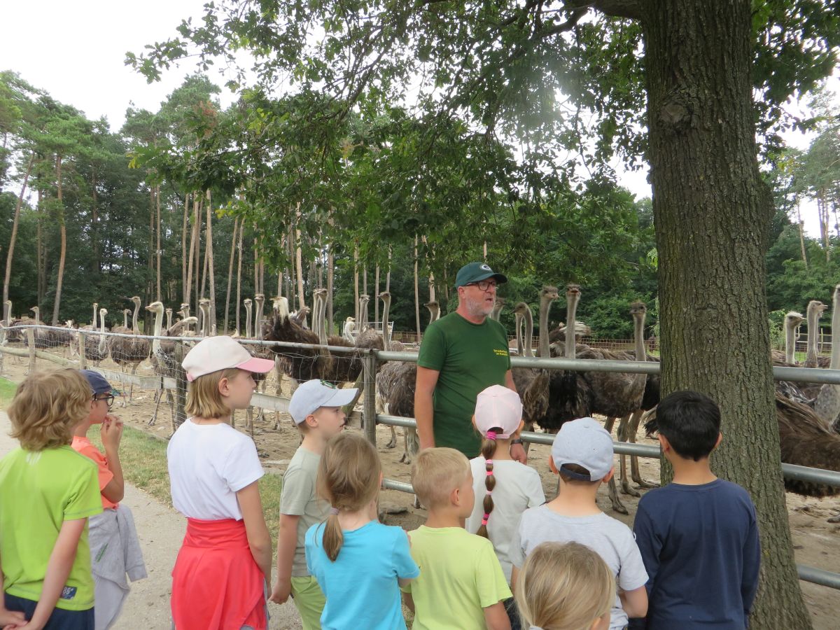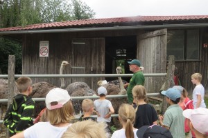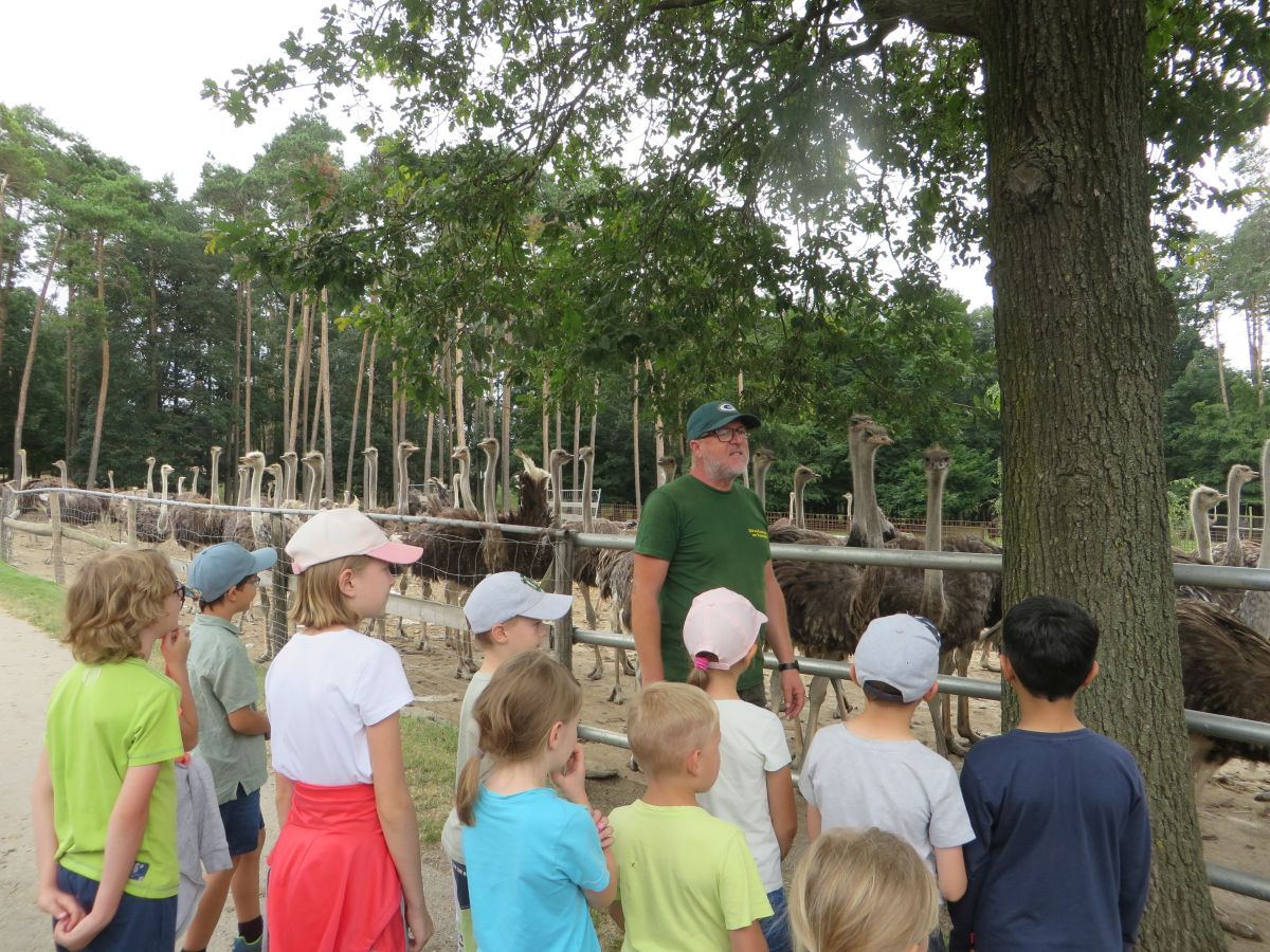 Nach einer anschaulichen Einführung ins Straußenleben sahen wir einen interessanten Impulsfilm über die Strauße in Schönberg. Wir beobachteten im Freigehege Emus, Nandus und natürlich Strauße. Die imposanten und zugleich angriffslustigen Laufvögel beeindruckten uns sehr.
