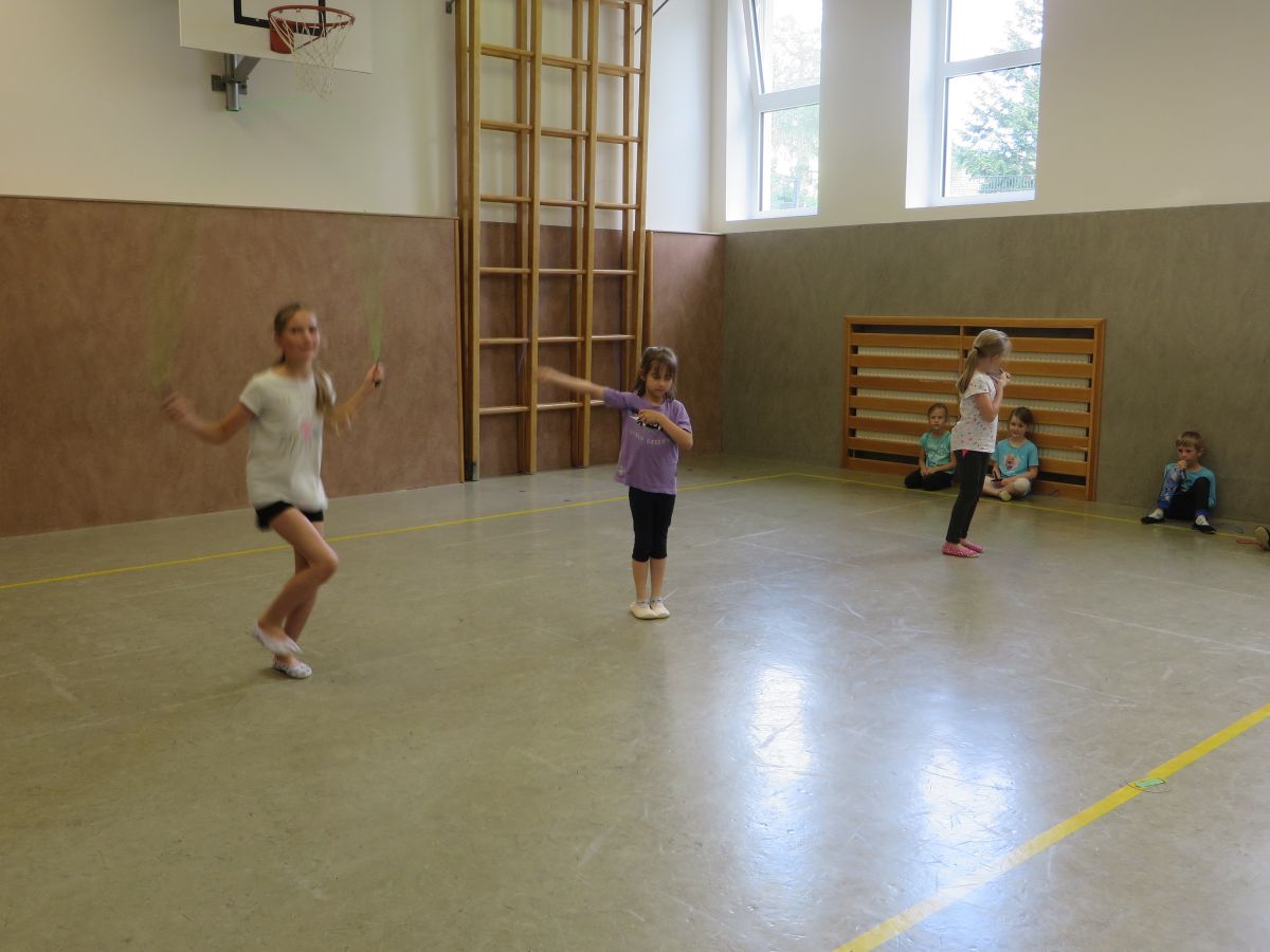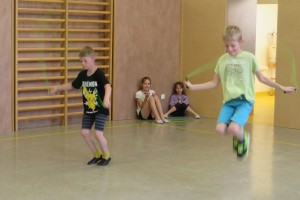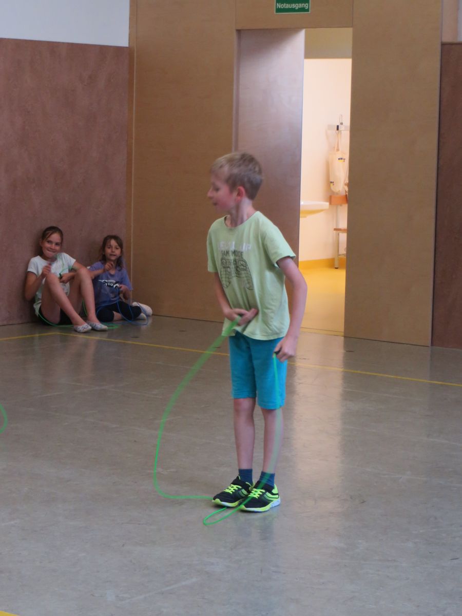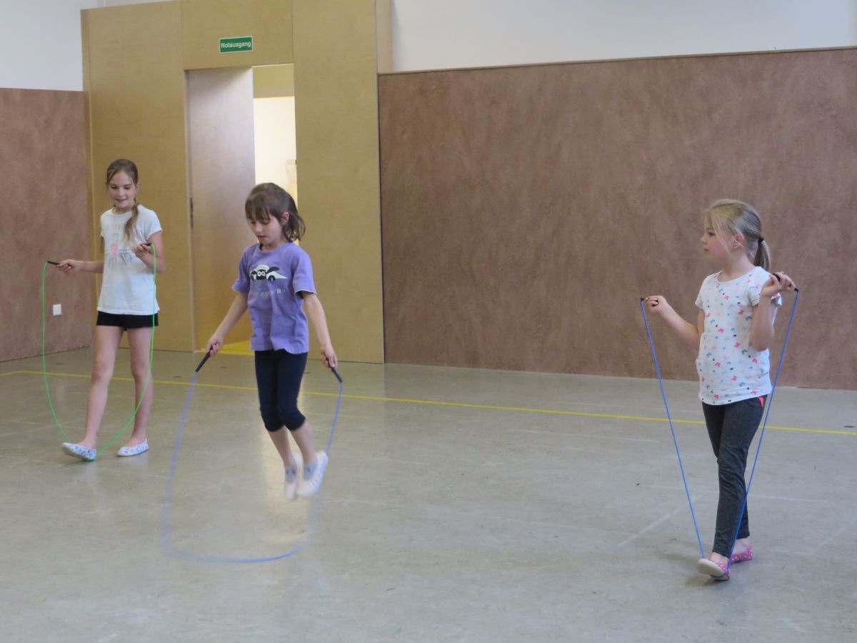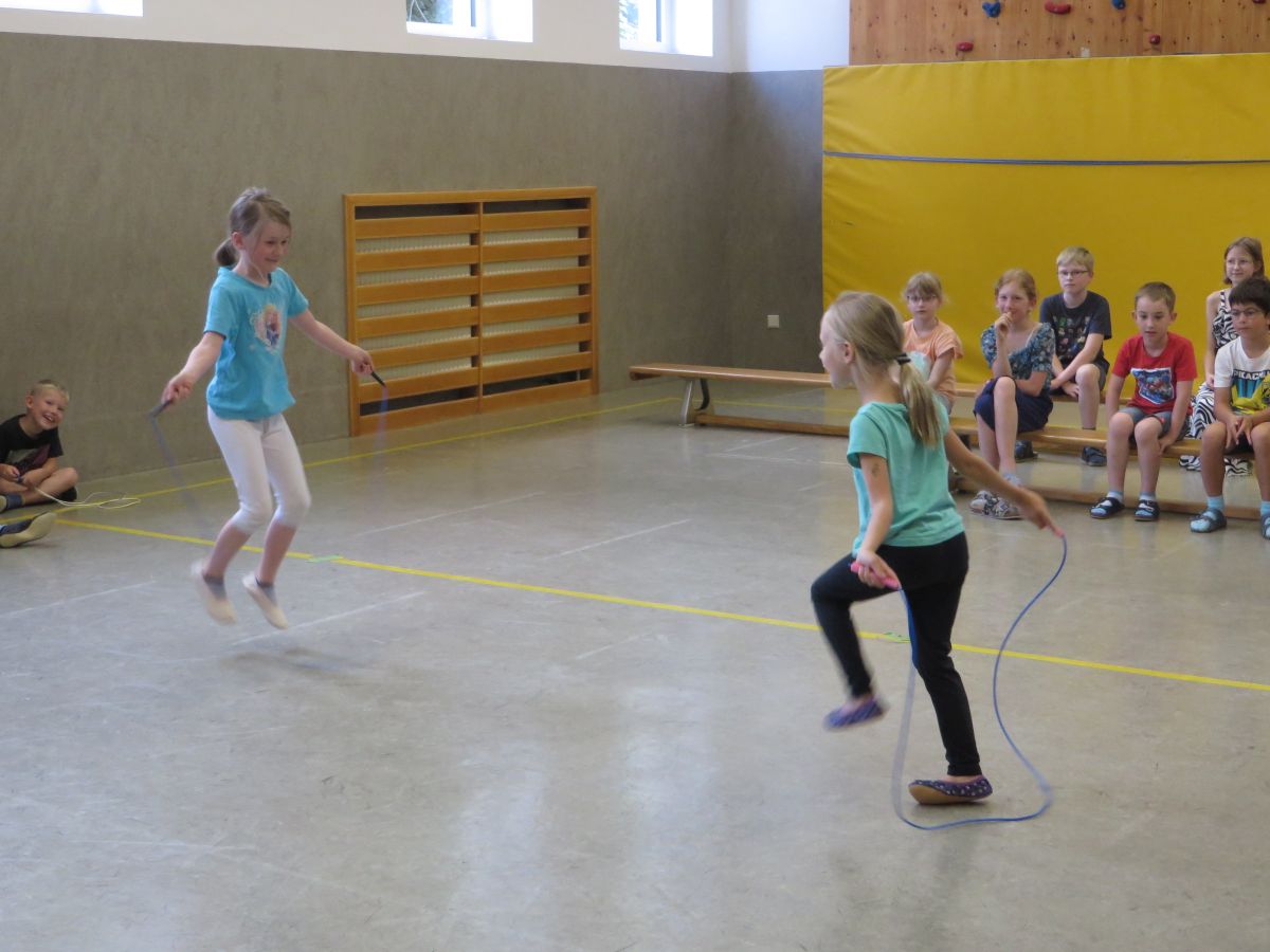 Zu flotter Musik zeigten die Skipper zuerst in Linienaufstellung eine gemeinsame Sprungabfolge. Danach konnten die Kinder bei ihrer Choreografie zeigen, was sie im Laufe des Jahres gelernt haben.
