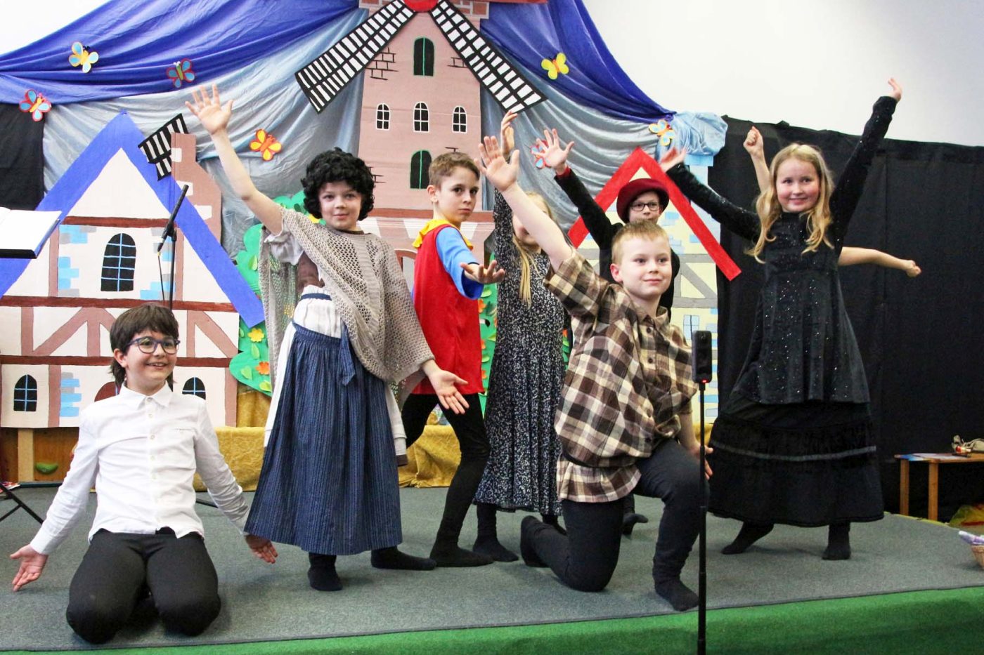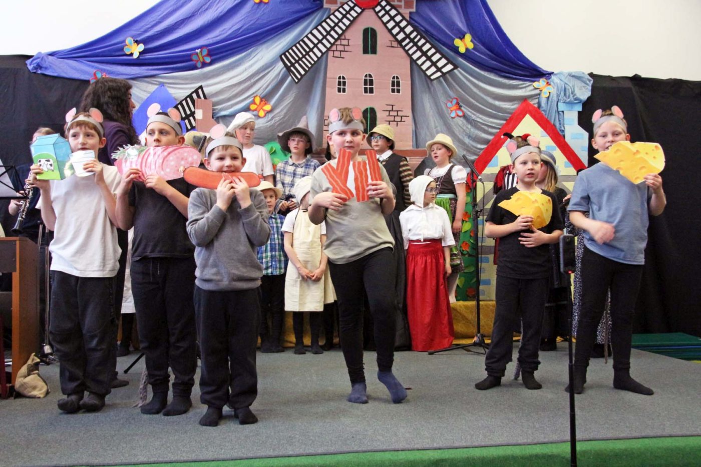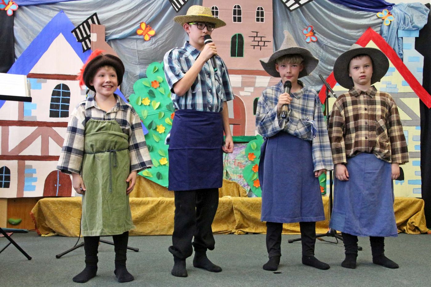 Der amüsante Inhalt drehte sich natürlich um einige Schildbürger-Streiche – darunter der Bau eines dreieckigen Rathauses ohne Fenster, der sehr kreativ mit dem Aufbau einer Mauer aus Schachteln umgesetzt wurde, die Bürgermeisterwahl mittels Reimwettbewerb und der Kauf eines Maushundes gegen die Mäuseplage. Die witzigen Texte brachten das Publikum immer wieder zum Lachen. Viele der in originellen Kostümen gekleideten jungen Darsteller entpuppten sich dabei als talentierte Schauspieler. Das gilt auch für die Gesangssolistinnen – vor allem Victoria Glasner begeisterte mit ihrem Luftschlösserlied die Zuhörer.